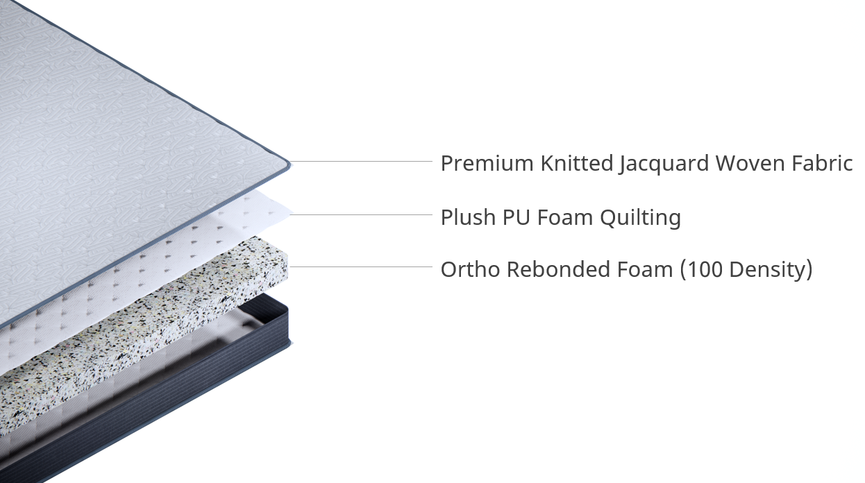 Introducing Bondo, the perfect choice for those seeking an orthopedic solution for a restful night’s sleep. Made with 100% Orthopedic Rebonded foam of 100 density, the mattress ensures optimal firmness, making it ideal for relieving back pain and providing unparalleled support. It helps alleviate pressure points and promote proper spinal alignment. Its premium quality knitted fabric with PU foam quilting provides a plush surface feel. Its ergonomic design and dual-face usability offer comfort and durability, giving you a good night’s sleep every time.